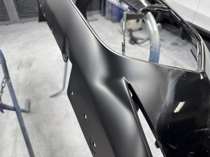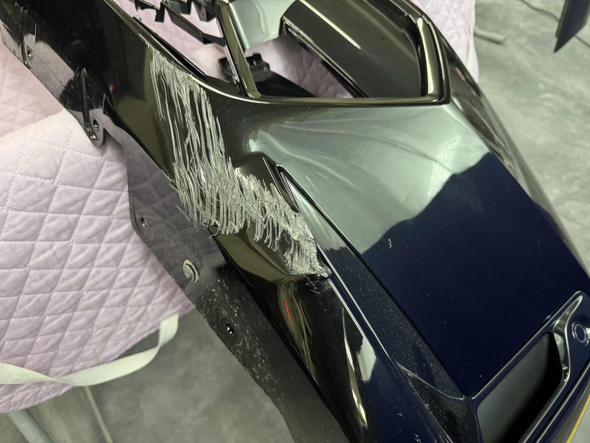 フロントバンパーの左側下の部分を縁石に乗り上げてしまい、バンパーに深い傷と変形がありました。新品交換するとバンパーカバー(無塗装状態)だけで¥162,000と高額なので、板金塗装で直すことになりました。
